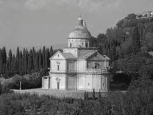 Below the town, off S 146 to Pienza. An avenue of cypress trees leads to this magnificent church, dedicated to Our Lady of San Biagio and built of pale golden stone, which stands in a delightful setting in the middle of a grassy stretch of flat land high above the valley. It is the masterpiece of Antonio da Sangallo the Elder and was inaugurated in 1529 by Pope Clement VII, a member of the Medici family. As Sangallo's building was strongly influenced by Bramante's plan for the reconstruction of St Peter's in Rome which, owing to the artist's death, was not carried out as planned, it is a valuable reminder of the designs drawn by the architect for the Pope.