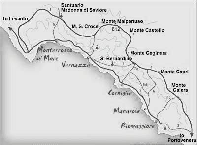 Here we find untamed nature, completely virgin Mediterranean maquis. It is a breathtaking composition, a mosaic of a thousand shades, the old houses with their characteristic colours clinging to rocks that drop sheer to the sea or perched on imposingly jagged hills, everything vying to touch the sky, lifting our gaze to the famous terraced siopes, "reclaimed land contained by drystone walls". This was work done long ago, at a time lost in history, by the local folk, a people well accustomed to contending with the difficulties of dizzying dliffs or precipitous siopes when getting about, and who, in order to survive, had to 'steal" space. The terraces are works of peasant engineering, an operation which we can call 'land architecture", and were used Io create space for the cuiltivation of vines, olives and fruit. Such agriculture, able to support the livelhood of this population, together with the ancient art of fishing practised in an uncontaminated sea, represents the major strength of this territory. A strength that, not without countless sacrifices, produces the famous white wine of the CINQUE TERRE, protected nowadays by the "d.o.c." hallmark (a guarantee of the wine's authenticity of origin); as well as the SCIACCHETRA' (a dessert wine made from partially dried grapes), the wine of the gods, as it was called in the times of the ancient Roman Empire; the OIL of a particular fragrance and acidity; and finaily the famous ANCHOVIES. ll this has been passed down from the people who lived bere in ancient times to the present day, bequeathing us the CINQUE TERRE in their setting of rare beauty and particular natural interest. The NATURE PARK and the MARINE PARK have created new opportunities for visitors, who can embark on spectacular sea or mountain excursions; marvel at leisure in the peace of the cliffs, the silence broken only by the crashing of the waves; or wander lazily through the "CARRUGGI" (maze-like narrow alleyways typical of the local villages) discovering for themselves the local crafts, the age-old activities of peasants and seafolk; or just simply wander in search of a table to sit und sample the anchovies and white wine of the "CINQUE TERRE".